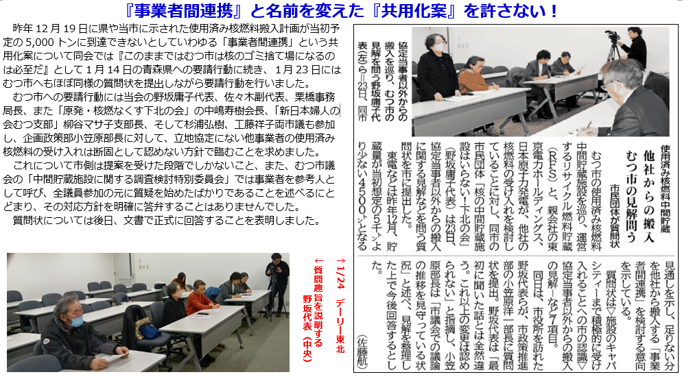 むつ市への質問状提出と申し入れを行いました